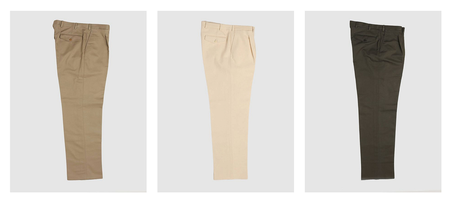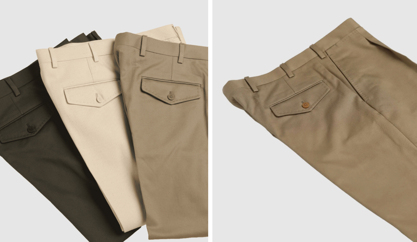 This month I’ve also collaborated with Nicola Radano in making what we think is the ultimate homage to the naval deck pant. These are made in a limited run of heavy deadstock RRL twill in khaki and olive as well as an ecru Japanese denim. The front has a single pleat with a wider leg, zipper fly and two back pockets. I cuffed mine but you can tailor them as you like.