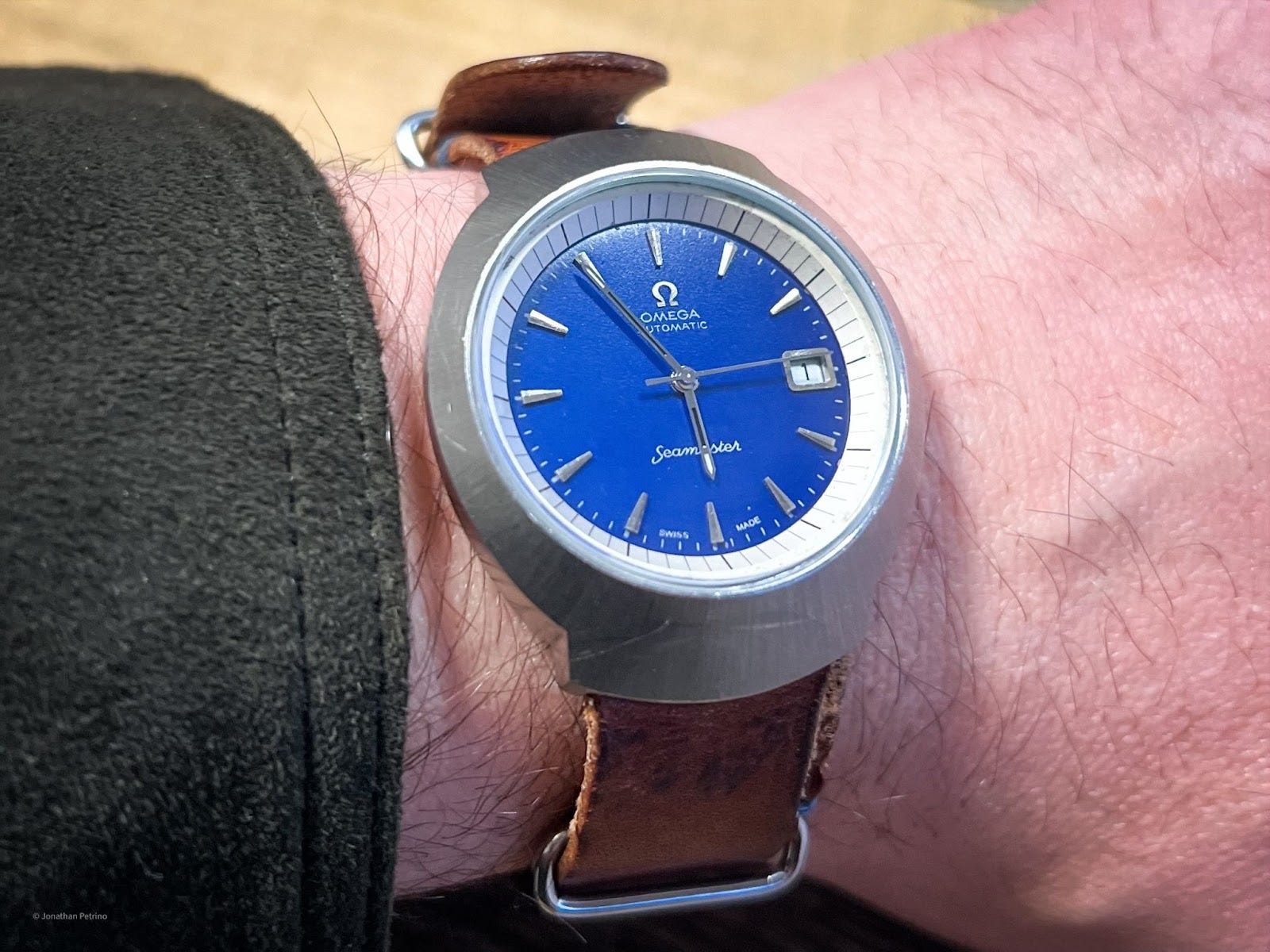 After trying a couple different straps, I landed on a Hodinkee leather NATO with just a few touches of blue stitching to echo the dial. It’s aged beautifully and pairs naturally with the patina the watch has earned over time.